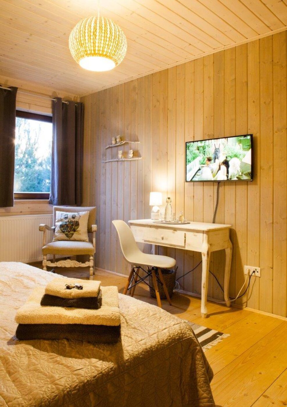 „SÓWKI” to pokój w kategorii dwójka PLUS. Położony jest on na piętrze budynku A. Jest to pokój dwuosobowy z prywatną łazienką. Goście mogą korzystać w pokoju z dostępu do sieci wi-fi i szybkiego internetu światłowodowego. PLUSEM jest klimatyzacja, okno wychodzące na jezioro i ogród, lodówka barowa, czajnik, kawa, herbata, zaopatrzony minibar.